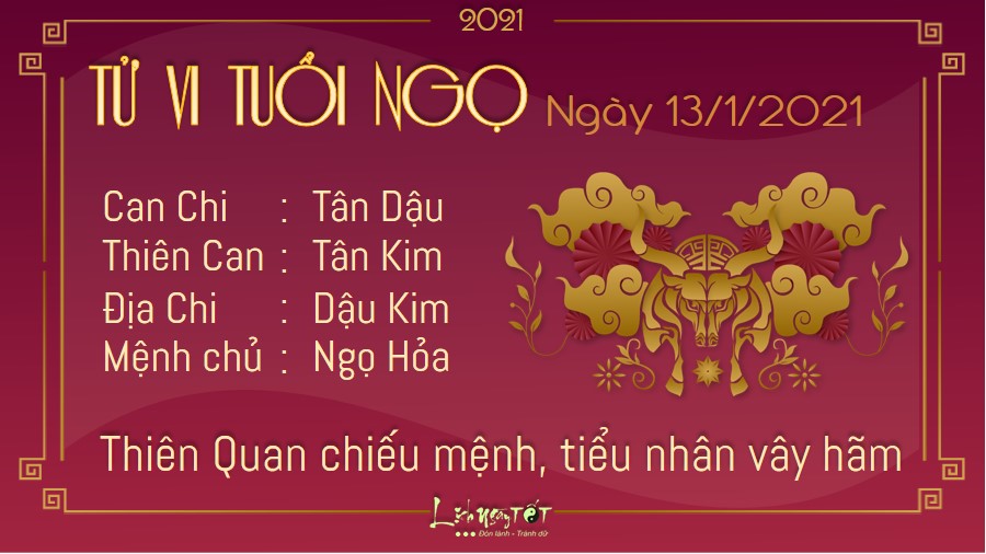 Thiên Quan xuất hiện cảnh báo vận trình của người tuổi Ngọ sẽ khó có thể bứt phá được. Bạn dễ vướng phải họa tiểu nhân khiến mọi công việc trở nên dang dở, khó hoàn thiện được như mong đợi. Kim Hỏa xung khắc, dù là người độc thân hay người đã có đôi có cặp thì đều cần phải chú ý hơn đến các mối quan hệ khác giới của mình. Những hiểu lầm xảy đến sẽ khiến cho chuyện tình cảm của bạn xuất hiện những vết rạn nứt lúc nào chẳng hay. Trong ngày mùng 1 âm lịch này, bản mệnh có thể đi về hướng Tây Nam để gặp Hỷ thần và Tài thần. Nếu đi theo hướng này, chắc chắn những kế hoạch tính toán của bạn sẽ trở nên suôn sẻ hơn nhiều.