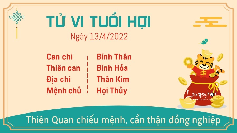 Tuổi Hợi có Thiên Quan chiếu mệnh, đi làm cẩn thận đồng nghiệp, tiểu nhân tranh đấu, cướp công. Nếu cảm thấy năng lực của mình so với đồng nghiệp có phần thấp kém hơn thì bạn cần nhanh chóng vực dậy tinh thần. Đường tình cảm may mắn nhờ cục diện Kim sinh Thủy nên cuộc sống đỡ áp lực hơn rất nhiều. Bạn có thể xin nghỉ làm và đến một nơi nào đó yên tĩnh để tinh thần, đầu óc được thư giãn cùng người yêu, bạn bè cũng rất tốt đấy. Mặt tài lộc có thay đổi tốt, sự ổn định và sự an toàn luôn là những yếu tố không thể thiếu của bạn. Bạn có thể chiều bản thân mình một chút đó bởi may mắn đã mỉm cười với bạn rồi.