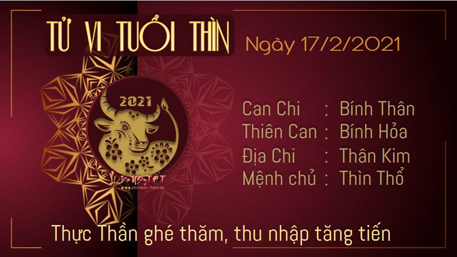Tam Hợp ở bên trợ mệnh, công việc của người tuổi Thìn trong ngày 17/2/2021 này sẽ trở nên hanh thông suôn sẻ hơn rất nhiều. Bạn có cơ hội gặp gỡ đối tác, ký kết các hợp đồng quan trọng trong ngày đầu tiên đi làm của năm mới này. Thực Thần ghé thăm, bản mệnh có sẽ có khoản thu nhập không hề nhỏ trong ngày hôm nay. Đặc biệt là với người làm kinh doanh buôn bán hay nghề tự do, vận may tìm đến, tiền bạc sẽ đổ về túi con giáp này ầm ầm. Thổ Kim tương sinh, người độc thân có thể gặp được nhân duyên của cuộc đời mình một cách tình cờ và bất ngờ. Hãy mở lòng và cho đối phương cơ hội được tiếp cận và tìm hiểu thêm về nhau nhé.