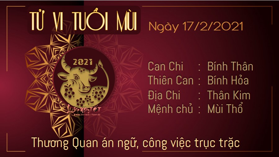 Thương Quan án ngữ tác động lên vận trình của người tuổi Mùi, khiến cho con giáp này phải đối mặt với không ít tin xấu trong ngày khai xuân năm mới này. Chuyện làm ăn gặp trục trặc, tiền bạc dễ bị thất thoát vì những quyết định sai lầm từ trước đó. Đây chính là lý do, bản mệnh luôn phải tỉnh táo và cẩn trọng trong từng quyết định của bản thân. Sự hiếu thắng khiến bạn phải đối diện với những hậu quả không lường. Hãy học cách sống khiêm tốn, lắng nghe lời khuyên của những người có kinh nghiệm đi trước để có được bài học cho bản thân. Ngày Kim Thổ tương sinh, chuyện tình cảm lứa đôi hứa hẹn sẽ có những bước tiến triển vượt bậc.