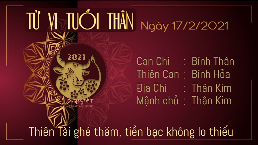 Tuổi Thân sẽ chẳng phải lo lắng về vấn đề tiền bạc trong ngày có Thiên Tài ghé thăm như hôm nay. Nguồn thu nhập phụ có bạn sẽ gia tăng nhanh chóng nhờ các khoản tiền được cho, tặng, thưởng hay lì xì trong ngày khai xuân đầu năm này. Hãy vận dụng sự nhạy bén và linh hoạt của mình đã chớp lấy cơ hội phát tài ngay trước mắt nhé. Chắc chắn bạn sẽ thu về một khoản không hề nhỏ đâu, đừng bỏ lỡ chúng để rồi cảm thấy hối tiếc về sau. Trong ngày Kim khí vượng như hôm nay, bản mệnh nên chú ý đến chế độ sinh hoạt ăn uống của bản thân. Nếu không có sự điều chỉnh phù hợp, bạn sẽ dễ mắc các bệnh liên quan đến dạ dày, đường ruột hay hệ tiêu hóa.