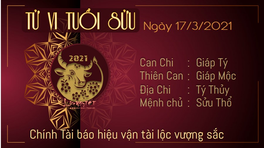 Lục Hợp trợ mệnh, người tuổi Sửu trở nên sáng suốt hơn hẳn. Bạn biết cách lập và triển khai các kế hoạch dự án một cách hiệu quả nhất. Sự tín nhiệm của mọi người dành cho bạn quả không sai. Chưa kể Chính Tài còn báo hiệu vận may về tài lộc có thể tìm đến với mệnh chủ. Những hợp đồng được ký kết trước đó nay mới có thể thấy được hoa thơm trái ngọt của nó. Đây chính là phần thưởng lớn nhất dành cho bạn lúc này. Tuy nhiên, ngũ hành Thổ khắc Thủy lại chỉ rằng, chuyện tình cảm của bạn đang dần trở nên phức tạp hơn khi có người 3 chen chân vào giữa hai người. Nếu không sớm hóa giải hiểu lầm, gạt bỏ mâu thuẫn thì sớm muộn đôi lứa sẽ bạn sẽ sớm lâm vào cảnh chia lìa đôi ngả thôi.