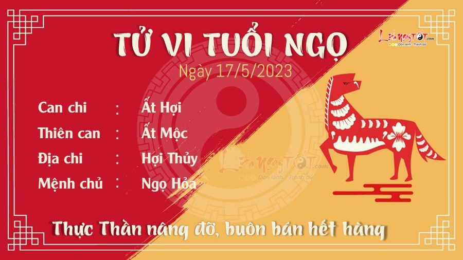 Hôm nay tuổi Ngọ có cát tinh chiếu mệnh nên sẽ đòi lại được quyền lợi trong công việc, tự tin đứng trước đám đông để thể hiện năng lực. Bạn tập trung phát triển công việc, vừa bớt sân si với người khác nên có thêm kinh tế cho mình, cuộc sống dành cho công việc khiến bạn thoải mái. Vận trình tài lộc vô cùng tốt đẹp nhờ sự nâng đỡ từ Thực Thần, làm ăn ký kết hợp đồng nhanh như gió, buôn bán nhanh hết hàng, có lãi hơn mọi ngày. Nhiều bạn còn được người thân, khách hàng cho quà hoặc cấp trên cho tiền thưởng nóng. Nhưng tình duyên lại kém sắc vì Thủy Hỏa bất dung. Có khi ở một mình lại là lựa chọn đúng đắn và an toàn nhất, hội độc thân nên hạn chế tìm tới tình yêu trong hôm nay. Sau lưng nhiều người còn có áp lực từ gia đình, xã hội nên khó mà an yên được