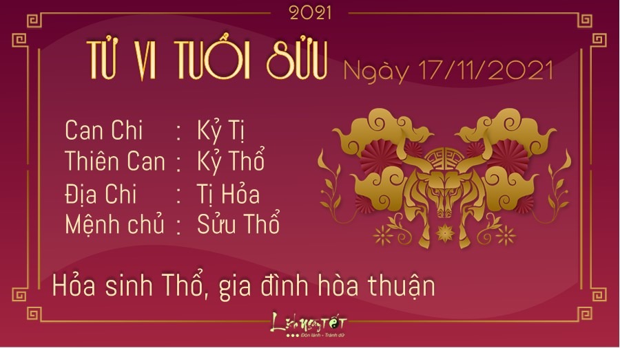 Hỏa sinh Thổ, người tuổi Sửu nhận được sự quan tâm, chăm sóc của các thành viên trong nhà. Người thân chính là động lực để bạn cố gắng không ngừng nghỉ mỗi ngày. Khi gặp khó khăn, bạn cũng không ngại ngần chia sẻ với họ. Người còn độc thân có thể được giới thiệu cho đối tượng triển vọng vào ngay hôm nay. Dù lần đầu tiên gặp mặt, đôi bên có thể chưa gây được ấn tượng quá rõ ràng cho nhau, nhưng nếu kiên trì nói chuyện lâu dài, hai người có thể phát hiện ra điểm hay của nhau. Tỷ Kiên luôn thôi thúc bạn cố gắng làm việc không ngơi nghỉ, ngay cả khi bạn không nhận được sự cổ vũ, động viên của bạn bè, đồng nghiệp. Có điều, bạn cần học cách lắng nghe mọi người nhiều hơn, đừng khăng khăng với quan điểm của mình.