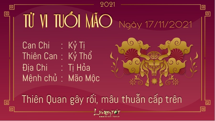 Thiên Quan đem tới những tác động tiêu cực cho sự nghiệp của người tuổi Mão. Bạn dễ gặp khúc mắc với cấp trên mà nếu giải quyết không khéo, bạn có thể gây mất lòng đối phương, khiến quan hệ đôi bên trở nên căng thẳng. Có lẽ con giáp này cần thay đổi bản tính nóng nảy, thích bắt ép người khác làm theo ý của mình. Mỗi người có một suy nghĩ, một quan điểm khác nhau mà bạn không thể chi phối hết được. Hơn nữa, rất có thể đối phương sẽ có cách nhìn nhận, đánh giá vấn đề chính xác hơn bạn đấy. Mộc sinh Hỏa, mối quan hệ giữa bản mệnh và nửa kia được duy trì êm đềm và ổn định. Hai người thường xuyên trao đổi, chia sẻ mọi chuyện mà mình gặp trong cuộc sống với nhau. Quan hệ của hai bạn là điều khiến nhiều người ngưỡng mộ đấy.