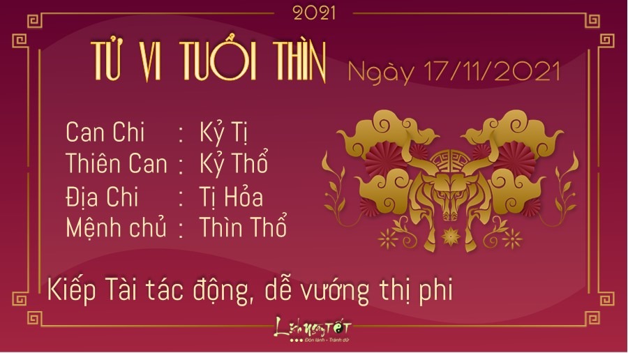 Kiếp Tài khiến người tuổi Thìn có thể vướng vào thị phi, tranh chấp với bạn bè, đồng nghiệp trong cùng một tập thể. Hãy giữ vững quan điểm của mình, đừng lung lạc theo lời của kẻ xấu. Nếu có thể, bạn hãy cố hết sức để bản thân mình đứng ngoài những cuộc tranh cãi vô bổ này. Hãy luôn nhìn nhận vấn đề thật chính xác, đừng nên tham lam muốn cướp công của người này người khác hoặc tìm cách khôn lỏi để giải quyết mọi chuyện. Nếu có việc cần phải đi xa trong ngày hôm nay, con giáp này nên xuất phát vào giờ hoàng đạo và lựa chọn những hướng đi tốt để công việc thêm phần thuận lợi. Hôm nay Hỷ thần xuất hiện ở hướng Đông Bắc và Tài thần xuất hiện ở hướng Nam.