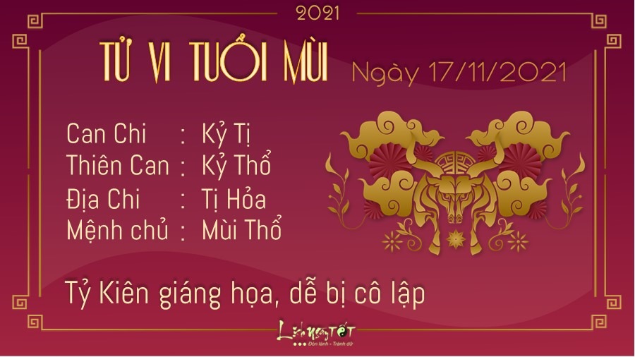 Tỷ Kiên cho thấy người tuổi Mùi dễ rơi vào tình cảnh bị cô lập trong ngày hôm nay. Có lẽ trước đó bạn đã sống quá khép kín nên nay, khi gặp phải khó khăn mới không được ai giúp đỡ. Con giáp này nên sống cởi mở hơn với mọi người xung quanh, đừng mãi sống trong thế giới của riêng mình. Trong công việc cũng như trong cuộc sống, có những rắc rối bạn không thể lường hết được, và bạn cũng không thể đơn thương độc mã giải quyết mọi việc một mình. Hỏa sinh Thổ, đối với người độc thân, bạn có thể nhận được sự quan tâm, chăm sóc của người khác. Hãy trân trọng những cảm xúc chân thành mà đối phương dành cho mình, đừng tiếp tục lạnh lùng như khoảng thời gian trước đó nữa nhé.