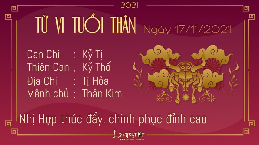 Dưới sự thúc đẩy của Nhị Hợp, tuổi Thân có thể vượt lên bản thân để chinh phục những đỉnh cao mới. Bạn không sợ hãi những khó khăn, thử thách mà sẵn sàng trải nghiệm. Mọi người đều rất ấn tượng với những gì bạn đã thể hiện. Tuy nhiên, dù đạt được thành công lớn đến thế nào đi nữa, bạn cũng chớ nên chủ quan hoặc quá tự mãn với những gì mình vừa gặt hái được. Xung quanh bạn vẫn còn rất nhiều người đáng để bạn học tập, vì thế, hãy luôn giữ thái độ khiêm tốn nhé. Hỏa khắc Kim, mối quan hệ giữa bản mệnh và nửa kia không được yên ấm. Có thể đôi bên đang hiểu lầm nhau về một vấn đề nào đó đấy. Trước khi đổ tội cho nhau, hai người đều cần phải bình tĩnh lại để suy nghĩ cặn kẽ vấn đề.