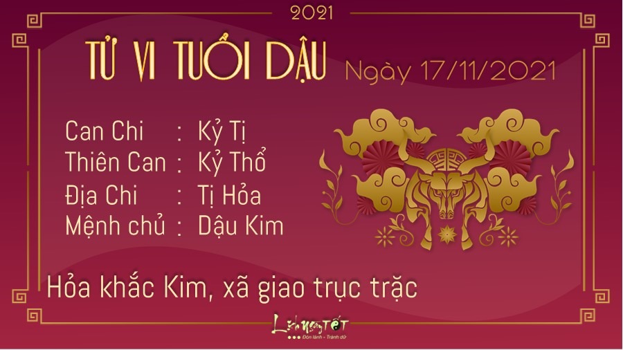 Hỏa khắc Kim, quan hệ xã giao của người tuổi Dậu dễ gặp phải trục trặc trong ngày hôm nay. Dường như bản mệnh và bạn bè, đồng nghiệp không thể đi được đến thống nhất chung trong nhiều vấn đề, khiến công việc khó mà tiến triển. Tốt nhất, bạn nên học cách thỏa hiệp với mọi người xung quanh, đừng đặt cái tôi của mình lên quá cao. Dù có gặp phải vấn đề nào, bạn cũng nên quan sát trên nhiều phương diện, có như vậy bạn mới có được cái nhìn toàn diện về công việc. Ngày 17/11 là ngày Tam nương sát, kỵ khai trương, xuất hành, cưới hỏi, sửa chữa hay cất nhà. Vì vậy, bản mệnh cần thu xếp công việc để thực hiện cho đúng. Nếu không gấp gáp, bạn nên lùi ngày thực hiện những công việc trên.