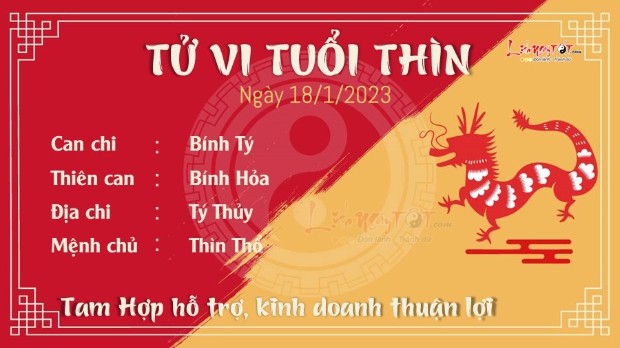 Tam Hợp nâng đỡ hỗ trợ cho con đường làm ăn của Thìn hôm nay. Là con giáp phản ứng nhanh, thông minh nên rất thuận lợi, người buôn bán kinh doanh chiếm được ưu thế lớn hơn so với người làm công ăn lương. Người theo đuổi con đường học vấn, thi cử sẽ cảm thấy mọi thứ vô cùng suôn sẻ như ý. Đường tiền bạc may mắn có Thực Thần nên Thìn lộc lá vô cùng. Đáng lẽ ra hôm nay bạn mất kha khá tiền nhưng nhờ cát tinh che chở nên không bị mất mát nhiều. Nhiều người có thời gian làm thêm việc phụ kiếm tiền tiêu vặt dịp Tết này, hôm nay cũng là ngày đẹp để bạn đi đổi tiền. Cục diện Thổ khắc Thủy kéo tình cảm của tuổi này đi xuống. Các bạn trẻ nếu chưa sẵn sàng thì tốt nhất là đừng vội vàng kết hôn. Con người sẽ chẳng ai mãi mãi như thuở ban đầu, nếu hôm nay có phát hiện ra ai thay lòng thì cũng đừng vội sốc vì đó là lẽ tự nhiên.
