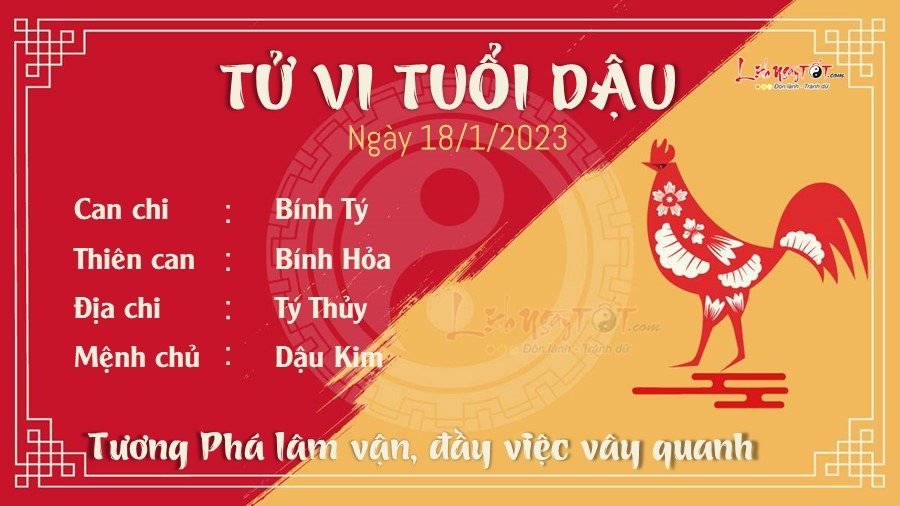 Tương Phá cảnh báo tuổi Dậu hôm nay nên làm việc chậm rãi, không hấp tấp kẻo "xôi hỏng bỏng không”. Bản mệnh suy nghĩ còn thiếu chiều sâu nên buôn bán chưa thể đẩy hàng đi nhanh. Người làm công ăn lương cuối năm vẫn đầy việc vây quanh, không có thời gian nghỉ. May mắn có Chính Tài cứu vớt nên Dậu cũng bớt mệt mỏi vì tiền. Tuổi này là con giáp được hưởng lộc từ con cái hoặc người thân ở xa gửi về. Bạn cứ tập trung cho công việc hiện tại thì lương thưởng cuối năm không phụ lòng bạn. Tình cảm là điểm sáng trong ngày nhờ Thủy sinh Kim. Tuổi này dành nhiều thời gian hơn cho gia đình, ăn trọn một bữa cơm với gia đình dưới ánh đen ấm áp. Bạn thích ở bên cạnh người thân trong thời gian cận Tết này, đối với bạn thì không đâu bằng nhà mình hết.