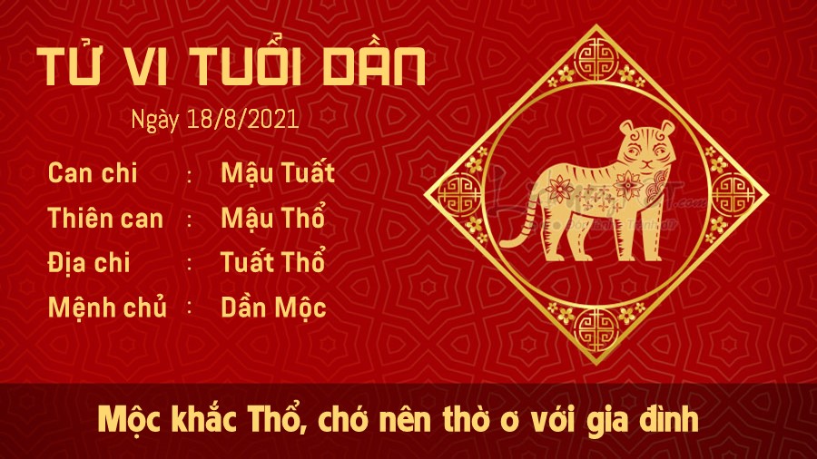 Mộc khắc Thổ khuyên người tuổi Dần cần phải dành nhiều thời gian bên gia đình hơn. Công việc quá bận rộn khiến bạn trở nên thờ ơ với những người luôn chờ đợi mình ở nhà và không nhận ra rằng tình cảm giữa các thành viên dần trở nên lạnh nhạt. Ở môi trường làm việc, bản mệnh khó được lòng người khác bởi cái tính cao ngạo và cố chấp, thích làm theo ý mình. Hãy khiêm tốn lắng nghe ý kiến của bạn bè, đồng nghiệp, có thể bạn sẽ tìm thấy những ý kiến hay đáng để học tập hoặc một hướng mới để giải quyết vấn đề. Nếu có việc cần xuất hành trong ngày hôm nay, bản mệnh đi theo những hướng Đông Nam để gặp Hỷ thần hoặc hướng Bắc để gặp Tài thần.