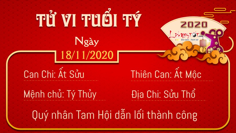 Con đường sự nghiệp của người tuổi Tý trở nên hanh thông thuận lợi hơn khi được quý nhân Tam Hội đưa đường chỉ lối trong khoảng thời gian này. Bạn dễ dàng đạt được những thành tích khiến cho ai nấy đều phải ngưỡng mộ. Lại thêm Thiên Ấn trợ mệnh, những người làm trong lĩnh vực nghệ thuật, kỹ thuật, dịch vụ, nghề tự do có cơ hội bộc lộ năng lực đáng gờm, khẳng định vị thế vững vàng của bản thân tại môi trường làm việc. Tuy nhiên, chuyện tình cảm của bản mệnh lại không mấy suôn sẻ trong ngày ngũ hành Thổ khắc Thủy này. Người độc thân gặp không ít cản trở để đến với người mình yêu, dường như bạn còn phải trải qua vô vàn thử thách nữa mới có thể có được hạnh phúc của riêng mình.