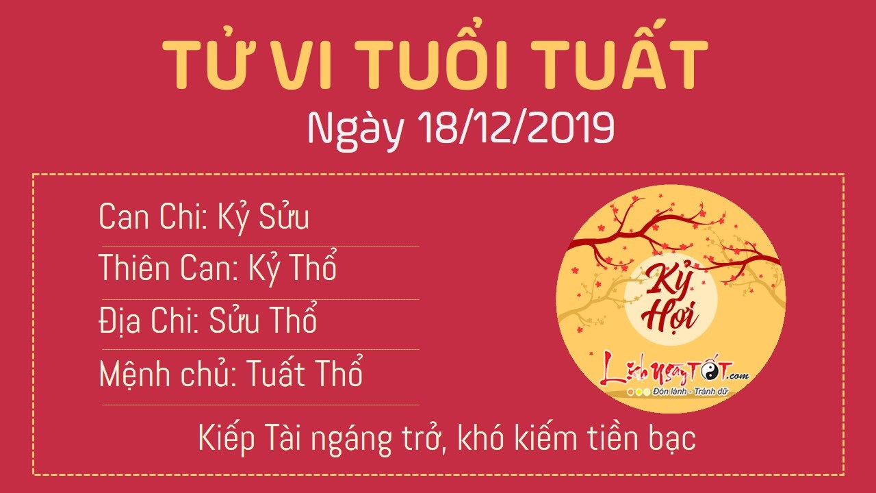 Sửu Tuất tương hình, người tuổi Tuất dễ cảm thấy tổn thương khi mà tình cảm của mình không được đối phương trân trọng. Mặc dù bạn mong muốn người ấy đáp lại nhưng lại chẳng nhận được gì. Kiếp Tài nhập cục, chuyện kiếm tiền cũng trở nên khó khăn hơn. Con giáp này không biết phải làm thế nào để cải thiện tình trạng hiện tại trong khi có biết bao nhiêu chuyện cần phải chi tiêu. Con giáp này nên nắm bắt mọi cơ hội ngay khi có thể. Tết đã sắp đến rồi, bạn không thể nào phung phí cơ may kiếm tiền, hãy cố gắng để tiết kiệm hết mức. Kiếm tiền mọi lúc mọi nơi, đừng từ chối tiền bạc đến với mình.