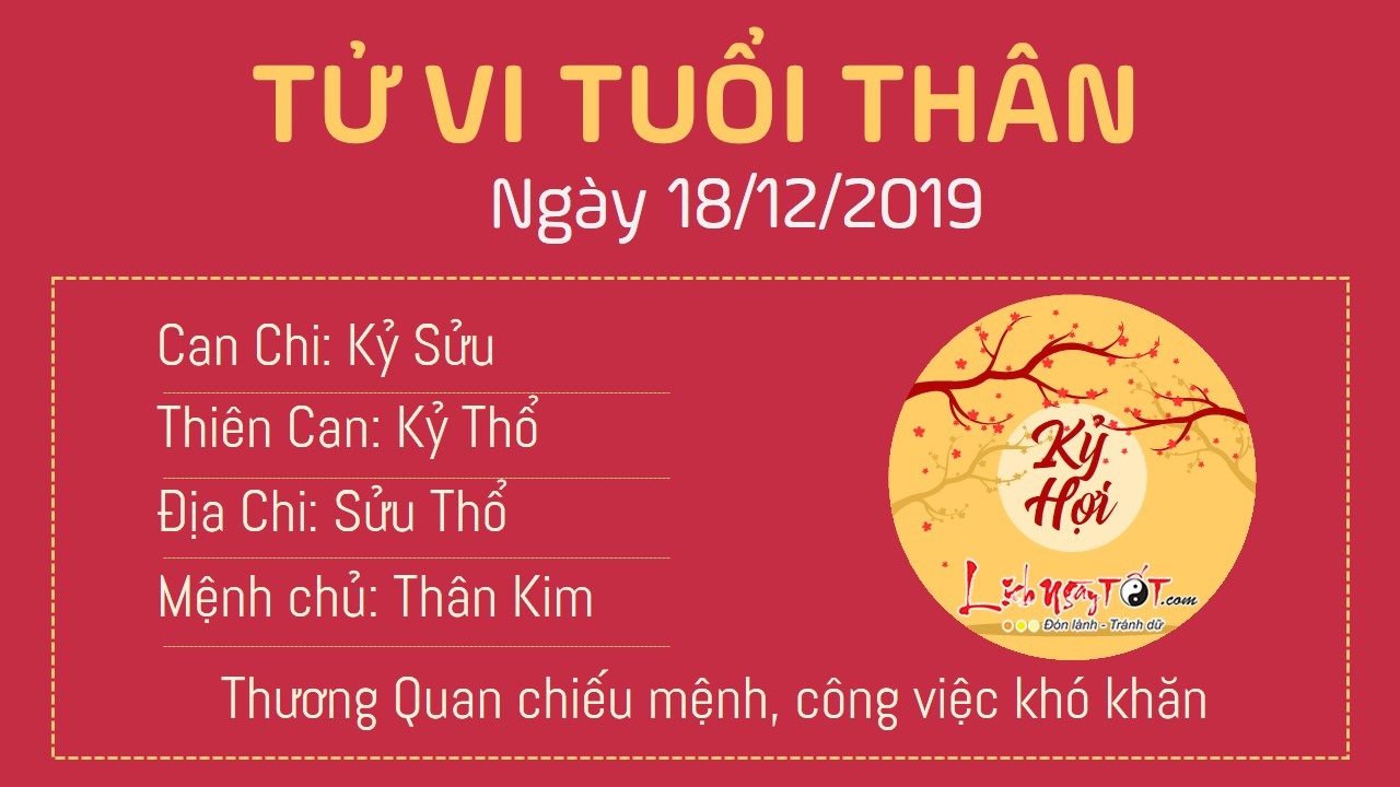 Thương Quan xuất hiện, tuổi Thân dễ mắc phải sai sót trong công việc, nhất là tinh thần làm việc bệ rạc, thiếu trách nhiệm. Con giáp này cần phải hiểu rõ mình đang làm việc vì cái gì. Bản mệnh đừng để tinh thần lung lạc bởi những lời xúc xiểm của kẻ tiểu nhân. Bạn cần phải có chính kiến của riêng mình, đừng để bản thân dễ bị ảnh hưởng bởi tư tưởng, tinh thần của người khác. Thổ dưỡng Kim, hôm nay là ngày tình duyên khá lý tưởng, đào hoa sẽ mang đến cho con giáp này nhiều điều bất ngờ. Bản mệnh không mong muốn mình sẽ đánh mất người mình yêu thì hãy thừa nhận tình cảm đi nhé.