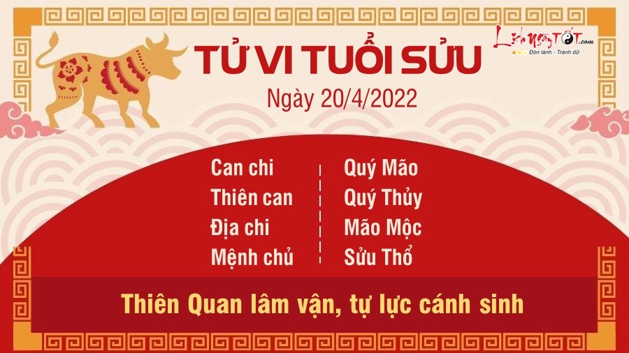 Ngày mới của tuổi Sửu kém may mắn đường công việc vì Thiên Quan lâm vận. Đi làm ăn ở đâu cũng không có người giúp đỡ, tự lực cánh sinh gánh hết việc. Người bán hàng thì hay gặp khách hàng khó tính khó chiều. Đường tình duyên vì cục diện Thổ khắc Mộc nên không nhiều bước tiến. Sửu độc thân thì bận lo công việc nên chưa có thời gian kiếm cho mình người thường. Mâu thuẫn giữa các cặp đôi ngày càng lớn lao, bạn nên chủ động hòa giải trước. Vận tài lộc cũng lao đao không kém, ít lộc. Nguyên nhân của việc này xuất phát từ nhiều yếu tố khác nhau, đặc biệt là do thời điểm này tuổi Sửu đang không ổn định về tinh thần.