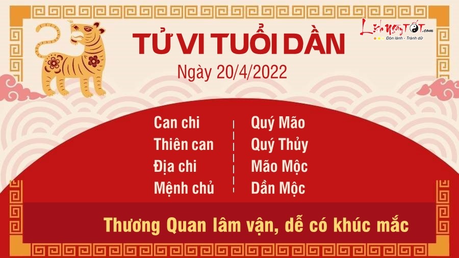 Tuổi Dần hôm nay có Thương Quan chiếu vận nên những bạn đang làm ăn hợp tác với anh em họ hàng dễ gặp khúc mắc, cạnh tranh. Khi đi làm bạn cần mềm mỏng và bớt nóng thì công việc mới suôn sẻ được. Vận tình cảm vì hai hành Mộc tương hòa nên đỡ lận đận hơn phần nào. Tuy nhiên bạn trẻ độc thân tuổi này dễ bị lừa tình, bị “leo cây” vì một người không xứng nên hãy cẩn thân. Người đã lập gia đình thì vất vả vì con cái nhưng con của bạn rất hiểu chuyện, thương cha thương mẹ. Tiền bạc cũng ổn định hơn trước. Bạn đừng cố tỏ ra hơn người khi có chút tiền trong tay, lộc lá không tự nhiên mà đến đâu, càng sống có đức càng có lộc. Thời gian này càng ít tiêu tiền thì ví tiền ngày càng ổn định hơn.