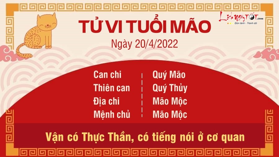 Công việc của Mão gặp Thực Thần nên có tiếng nói ở cơ quan. Ngày này dễ mà được cấp trên khen ngợi, đề xuất tăng lương, tăng thưởng được chấp thuận. Có ý kiến gì thắc mắc thì nên nói thẳng với cấp trên, biết đâu họ sẽ cân nhắc. Đường tình duyên vì hai hành Mộc tương hòa nên nhiều cặp đôi đang trong giai đoạn hạnh phúc, ổn định. Nếu có ấm ức trong lòng thì tốt nhất để cho mọi chuyện qua đi rồi hẳng từ từ giải thích cho người ấy hiểu nhé. Tiền bạc không có nhiều biến động nhưng dễ có lộc ăn uống, tặng quà, được thưởng. Tháng này đám đình nhiều nên cũng khó để dư ra được, có lộc thì tốt nhất nên tiết kiệm, đừng tiêu xài hoang phí.