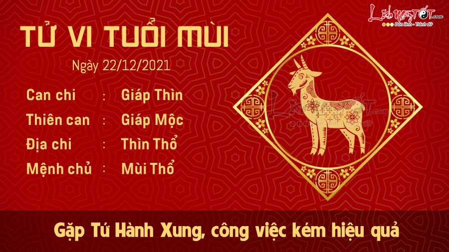 Mùi gặp Tứ Hành Xung nên làm việc kém hiệu quả hơn những ngày trước. Có vẻ như bạn đang lo lắng cho chuyện cá nhân nên mất tập trung trong công việc. Nên xốc lại tinh thần, đừng để kẻ xấu lợi dụng điều đó để làm hại bạn và cướp đi lợi ích đáng lẽ ra thuộc về bạn. Tình cảm bình ổn, gia đình chính là chỗ dựa tinh thần của Mùi trong ngày này. Hai hành Thổ tương hòa nên tình cảm thiên về truyền thống. Bạn là người hiền lành, điềm tĩnh và đáng tin cậy trong con mắt của mọi người. Nhân duyên không phải tự nhiên đến mà nhờ vào tính cách của bạn. Đừng quá lo lắng vì đường tài lộc của bạn hôm nay vẫn ổn. Bạn luôn được đền đáp xứng đáng ở mặt tài chính. Cơ hội kiếm tiền được người khác đem tới khá nhiều, nhiều người ghen tị với Mùi ở điểm này.
