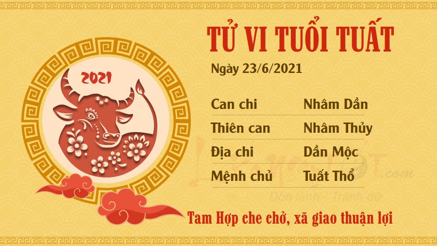 Tam Hợp độ mệnh, các mối quan hệ xã giao của tuổi Tuất trở nên tốt đẹp hơn bao giờ hết. Bản mệnh còn có cơ hội hợp tác ký kết những hợp đồng quan trọng, đem lại nguồn lợi không hề nhỏ trong tương lai nữa. Tuy nhiên, Thiên Quan chiếu mệnh là lời cảnh báo con giáp này cần phải hết sức chú ý trong các mối quan hệ với những người quyền cao chức trọng. Chỉ cần một lời nói hay cách hành xử thiếu suy nghĩ cũng đủ khiến bạn mang rắc rối vào mình rồi. Sức khỏe của bản mệnh có phần giảm sút hơn trong ngày Mộc khắc Thổ này. Có vẻ như bạn đang làm việc quá sức rồi, hãy mau chóng điều chỉnh lại chế độ sinh hoạt và nghỉ ngơi điều độ hơn, đừng để đến khi bệnh tật tìm đến rồi mới hối tiếc.