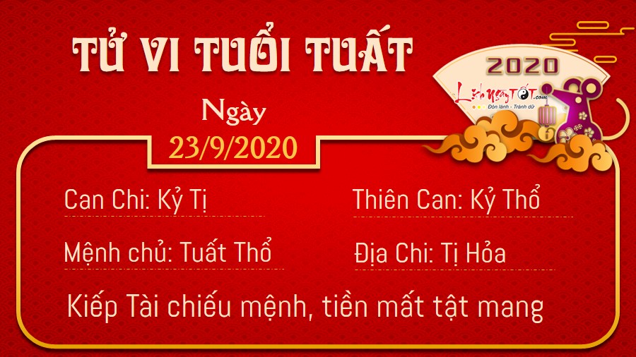 Người tuổi Tuất có thể gặp khá nhiều bất lợi liên quan đến tiền bạc trong ngày Kiếp Tài chiếu mệnh như hôm nay. Những chuyện tranh lợi đoạt tài dường như chẳng còn xa lạ trong môi trường làm việc. Vì vậy, để bảo toàn túi tiền của mình, tốt nhất con giáp tuổi Tuất nên tránh xa những chuyện thị phi tranh chấp đầy tai tiếng này. Những hành động liều lĩnh cũng khó có thể giúp bạn trong ngày này khi mọi thứ vẫn còn đang rất mơ hồ, chẳng thể lý giải nổi. Hỏa sinh Thổ, sức khỏe của con giáp này được cải thiện đáng kể trong ngày hôm nay. Nhờ chế độ sinh hoạt điều độ cùng việc chăm chỉ luyện tập thể dục thể theo mà bạn mới có được một cơ thể khỏe khoắn, một tinh thần vui tươi như thế này.