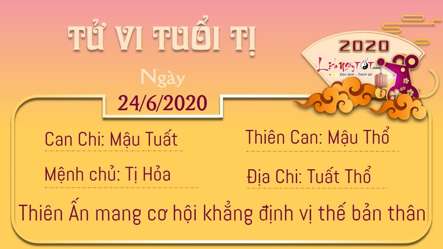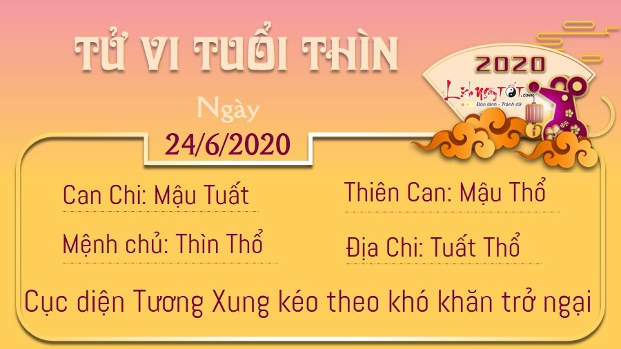 Có Tỷ Kiên giúp sức, bản mệnh dễ dáng tránh xa được những rắc rối và những tranh đấu quyền lực liên quan đến tiền bạc. Tinh thần làm việc hăng say giúp bạn nhanh chóng xử lý các vấn đề phát sinh. Con giáp sống có kế hoạch này biết mình phải làm gì trong mốc mục tiêu mà mình đặt ra. Những bước đi tuy chậm rãi những vững chắc của con giáp tuổi Tuất đã giúp cho bạn rất nhiều trong thời điểm này. Ngày 24/6/2020 dương lịch là ngày Can Mậu. Theo đó trong ngày can Mậu này bản mệnh không nên có các tác động hay không trị bệnh ở bụng để tránh những rủi ro bất trắc có thể xảy ra.