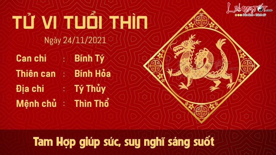 Tam Hợp giúp sức, người tuổi Thìn có những suy nghĩ tỉnh táo và minh mẫn trong ngày hôm nay, vì thế mà bạn chủ động tránh được những cái bẫy của kẻ tiểu nhân, không đưa ra những quyết định sai lầm. Tinh thần lạc quan, hăng hái của bạn cũng truyền động lực cho mọi người xung quanh, khiến bầu không khí làm việc của cả tập thể đều được đẩy lên cao. Hôm nay, mọi người có thể hợp sức để cùng gặt hái thành công. Thổ khắc Thủy, tiếc là mối quan hệ giữa bản mệnh và nửa kia không được êm ấm. Đôi bên mâu thuẫn với nhau có thể chỉ vì những chuyện nhỏ nhặt. Không ai chịu nhường ai khiến quan hệ đôi bên dễ lâm vào bế tắc.
