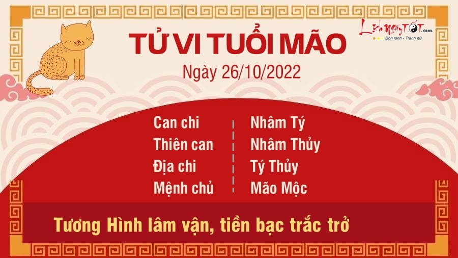 Vận lâm Thương Quan khiến sự nghiệp của Mão trong ngày thứ 4 này lao đao, vất vả. Bạn đúng trăm lần không ai thấy nhưng chỉ cần sai một lần là người ta nhắc mãi. Tuổi này buôn bán nên cẩn thận đối thủ cạnh tranh dở chiêu trò “bẩn” hạ uy tín. Mặt tài vận chịu áp lực, nhiều muộn phiền, trắc trở do lâm Tương Hình. Gần đây bạn phải làm việc rất lao lực vì áp lực tiền bạc đem lại. Nhiều lúc bạn muốn bỏ cuộc nhưng không thể vì nếu như bạn không làm thì không ai gánh hộ nợ nần, các khoản chi tiêu của gia đình. Nhờ cục diện Thủy Mộc tương sinh, Mão được an ủi phần nào trong chuyện tình cảm. Hãy dùng nụ cười để sống cho hiện tại. Bởi trong tâm vui vẻ thì trong mắt mới thấy ánh mặt trời, đừng quan tâm ánh nhìn của thiên hạ.
