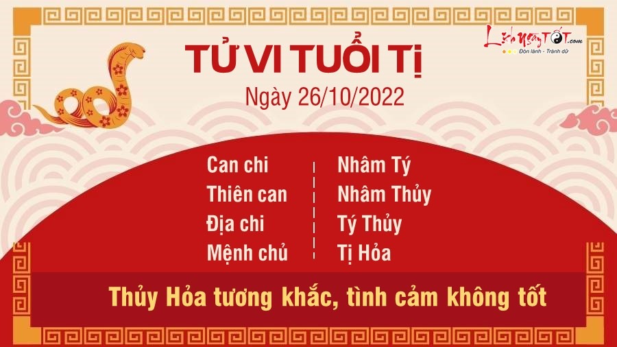 Ngày này bản mệnh gặp Thiên Tài nên công việc chính không có tiến triển. Tuy nhiên những ai có nghề tay trái, đi làm thêm sẽ được đồng nghiệp giúp đỡ, không bị cấp trên bắt bẻ. Ai làm tự do thì thoải mái, giỏi lập ra kế hoạch cho bản thân, giỏi chèo chống trước mọi gian khó. Đó cũng là tín hiệu tốt cho đường tài lộc của bản mệnh. Tuổi này đa phần là tự lực cánh sinh nhưng thi thoảng vẫn có quý nhân âm thầm giúp đỡ. Bạn đỡ tự ti hơn trước, mạnh dạn trong chuyện tiền bạc nên mạnh dạn làm ăn, có đồng ra đồng vào, không phải lo nghĩ nhiều. Tuy nhiên vì cục diện Thủy Hỏa tương khắc nên đường tình cảm không như ý muốn. Gần đây Tị không được thoải mái nên thường hay suy nghĩ linh tinh và cáu gắt với người thân. Thi thoảng bạn còn tự khép mình, hạn chế giao lưu với bạn bè, ghét những người hay nói nhiều.