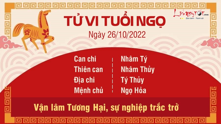 Công việc của Ngọ hôm nay trắc trở vì lâm Tương Hại. Làm gì cũng lủi thủi một mình, tự bươn chải không có ai giúp đỡ. Đi làm hay bị tiểu nhân cạnh tranh nói xấu, ngồi không cũng dính thị phi, cây muốn lặng mà gió chẳng chịu ngừng. Đường tiền bạc là điểm sáng trong ngày nhờ có Chính Tài nâng đỡ. Dù công việc trắc trở nhưng bạn vẫn kiếm tiền đều đều, lương nhận đủ không thiếu một xu. Một số người sẽ nhận được tiền thưởng muộn hoặc quà muộn trong thứ 4 này. Vận tình cảm có tín hiệu không tốt vì Thủy khắc Hỏa. Tự yêu bản thân là một điều hết sức quan trọng thay vì trông đợi sự hỗ trợ của bất cứ ai trong hôm nay. Bạn không nên trông chờ vào tình yêu quá nhiều, sống mà lụy tình quá thì thiệt thân.
