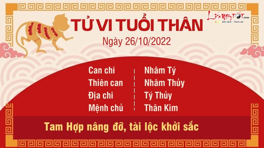 Tuổi này có Thiên Ấn trợ lực nên đường sự nghiệp cát nhiều hơn hung. Chỉ cẩn bản mệnh chăm chỉ, kiên nhẫn với mục tiêu của mình thì không ai có thể khinh thường, ngược lại tiếng nói của bạn còn có giá trị vô cùng. Tuy nhiên dù tài cao đến đâu cũng nên khiêm tốn, chăm chỉ học hỏi mới tiến bộ nhanh được. Dựa vào tử vi hàng ngày nhận thấy đường tài lộc của Thân khởi sắc nhờ Tam Hợp cục nâng đỡ. Người làm công ăn lương sẽ có thêm thu nhập phụ bên ngoài, người buôn bán kinh doanh thì đắt hàng. Ai gặp gỡ khách hàng để ký hợp đồng hôm nay sẽ thành công, sắp tới có tiền hoa hồng, thưởng nóng. Về phương diện tình cảm dễ có tin tốt đến nhà nhờ Kim sinh Thủy. Người đang ốm sẽ nhận được nhiều sự quan tâm hơn từ người thân và tìm được phương pháp trị bệnh thông qua người quen. Bạn nên trân trọng những mối quan hệ thân thiết, họ chính là quý nhân của bạn.