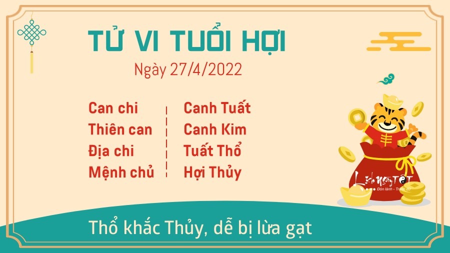 Thứ 4 của Hợi công việc có Thực Thần nâng đỡ nên những bạn làm công việc tự do sẽ có lộc. Là con giáp sống biết điều, bạn biết cách làm hài lòng lãnh đạo, đồng nghiệp, không làm phật ý người ta nên cứ đi làm ắt sẽ có người giúp. Tình cảm không như mong đợi vì Thổ khắc Thủy. Bạn quý trọng tình cảm nhưng lại không may mắn trong tình yêu. Có điềm bị bạn bè, người yêu lừa gạt mà không hay biết nên hãy cẩn thận. Tiêu xài quá tay là mối nguy trong ngày. Có những thứ tưởng chừng như rất nhỏ nhưng gộp lại thành một cục tiền. Ăn uống đầy đủ là được, muốn đi du lịch phải biết tiết kiệm tiền.