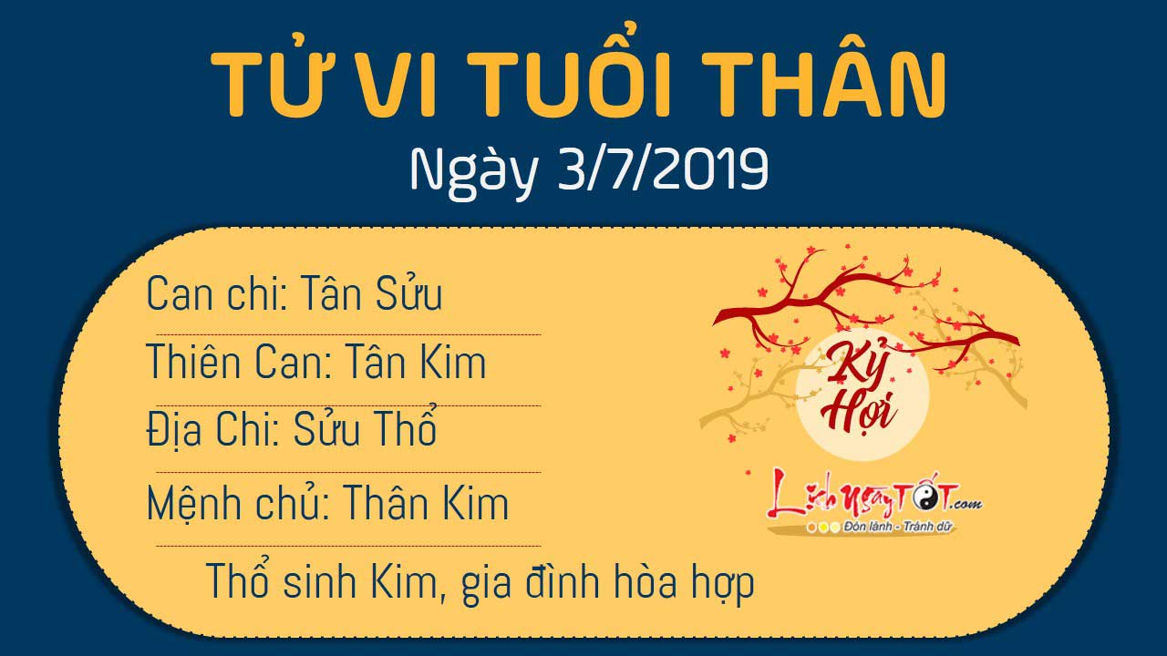 Thổ sinh Kim, người tuổi Thân còn độc thân rất đào hoa trong ngày hôm nay. Nhờ bản tính hài hước của mình mà bản mệnh dễ nhận được sự chú ý của những người khác phái. Đây là cơ hội tốt để mở rộng mối quan hệ của mình. Những người đã lập gia đình được tận hưởng bầu không khí hòa hợp giữa các thành viên trong nhà. Bạn chủ trương ai có vấn đề gì thì nên tâm sự với cả nhà ngay, sau đó mọi người sẽ cùng tìm cách giải quyết thích hợp. Tuy nhiên, Kiếp Tài khiến các mối quan hệ đồng nghiệp của bản mệnh không được thuận lợi như vậy.