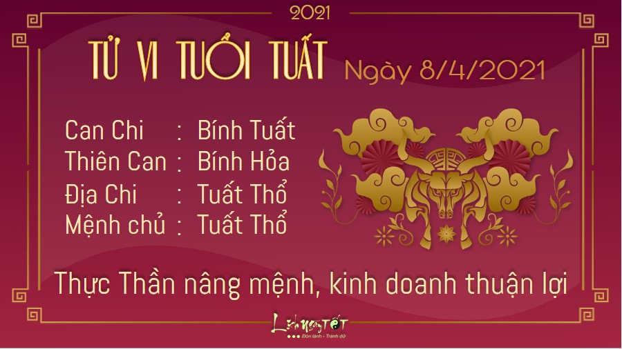 Thực Thần che chở nên tuổi Tuất đón nhiều tui vui tài lộc. Chuyện kinh doanh của bản mệnh đang diễn ra cực kì thuận lợi, tiền bạc thu về tay nhiều không kể xiết. Đặc biệt, cát thần này nâng đỡ cho những người làm nghề tự do, hãy tranh thủ cơ hội để kiếm về lợi nhuận cực lớn nhé. Tài thần ở hướng Chính Đông, sẵn đang may mắn về đường tài lộc thì bạn hãy chọn hướng này làm hướng xuất hành hoặc tiến hành các hoạt động cầu tài nhé. Thai thần ở cửa phòng và cửa sổ phòng thai phụ. Do đó, không nên dịch chuyển vị trí hoặc tiến hành tu sửa nơi này, tránh làm động Thai thần, ảnh hưởng đến cả người mẹ và thai nhi.