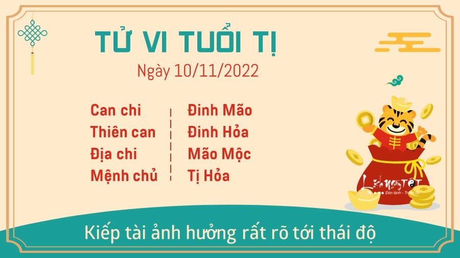 Kiếp tài ảnh hưởng rất rõ tới thái độ và cách ứng xử của con giáp tuổi Tị trong ngày hôm nay. Có thể thấy, với những vấp ngã, bạn sẽ thấy bản thân trầm lắng hơn hẳn. Ngũ hành tương sinh giúp cho người độc thân giao tiếp mượt mà hơn, nhờ đó mà bạn có thể làm quen với nhiều đối tượng ưng ý. Bản mệnh tha hồ lựa chọn ai là người phù hợp nhất với mình. Hôm nay có thể bạn cũng tìm ra rất nhiều giải đáp cho câu hỏi của mình suốt thời gian qua về khía cạnh tình cảm. Ngày 10/11/2022 dương lịch là ngày Can Đinh: Ngày này không nên trị bệnh ở tim. Do đó, bản mệnh lưu ý tránh tác động lên vị trí này trong ngày hôm nay.