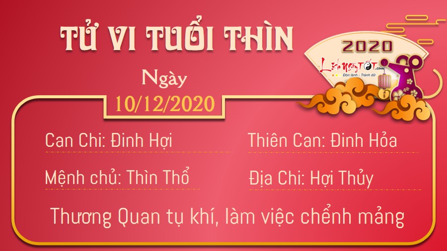 Người tuổi Thìn không mấy tập trung vào công việc mình đang làm trong ngày Thương Quan xuất hiện như hôm nay. Nhiều vấn đề bên lề khiến đầu óc bạn quay cuồng, chểnh mảng, phân tâm lo nghĩ. Bạn có thể sẽ bị cấp trên nhắc nhở vì hiệu suất làm việc càng ngày càng sụt giảm đó. Nếu tình trạng này tiếp diễn thường xuyên thì lúc đó có bao biện thế nào cũng không thể bào chữa được cho hành động vô trách nhiệm này đâu. Ngũ hành xung khắc nên chuyện tình cảm của những chú Rồng cũng không được như ý muốn. Ai cũng có cái tôi quá lớn, chẳng ai chịu nhún nhường khiến mâu thuẫn phát sinh ngày càng nhiều hơn.
