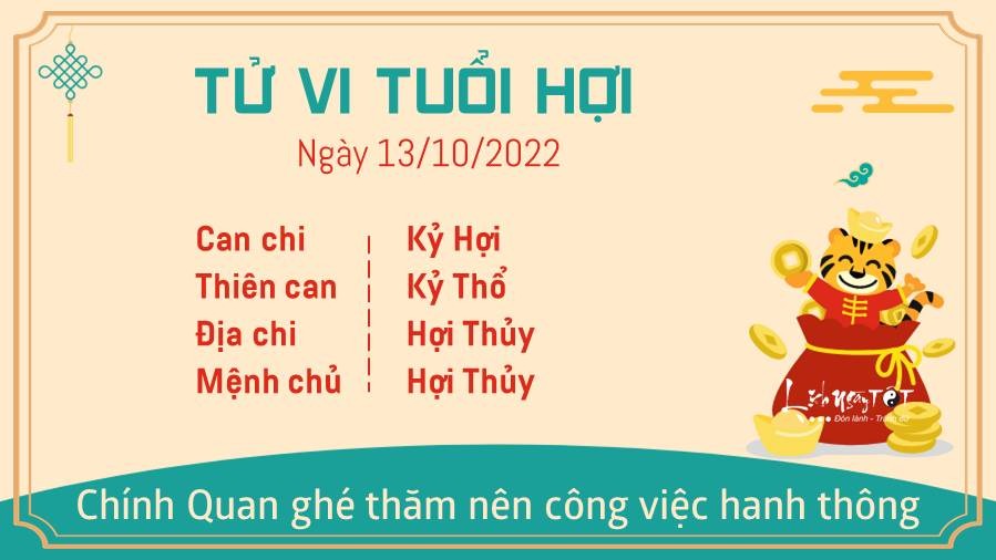 Chính Quan ghé thăm cho thấy hôm nay công việc hanh thông, cơ hội kiếm tiền bạc dành cho con giáp tuổi Hợi không thiếu, nhưng bạn phải chủ động nắm lấy nó. Sự thụ động có thể khiến bạn bỏ cơ hội và phải nuối tiếc đấy. Mạnh dạn lên nào! Hôm nay có những thứ đang kìm hãm tốc độ làm việc của con giáp tuổi Hợi, lý do rất nhiều thậm chí có những điều không giải thích được. Tuy nhiên, hãy nhìn vào mặt tích cực của nó đó là bạn có thể lùi bước một chút để nghỉ ngơi, đầu óc cũng nhờ vậy mà sáng suốt, tỉnh táo hơn. Ngày tốt theo Nhị thập bát tú cho thấy hôm nay tạo tác nhiều việc tốt như xây cất, trổ cửa dựng cửa, mở thông đường nước, đào mương móc giếng, nhậm chức, nhập học, đi thuyền.