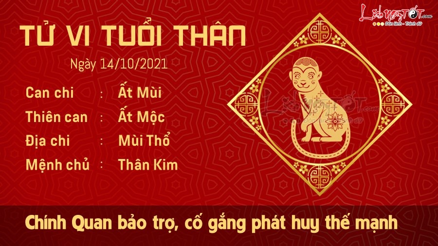 Chính Quan bảo trợ, đường công danh sự nghiệp của tuổi Thân trong hôm nay như trải thêm hoa hồng. Thời gian này bạn cần cố gắng phát huy hết thế mạnh bản thân, vận trình đang rất hanh thông nên chỉ cần bạn có quyết tâm là ắt sẽ có được thành công. Song cũng đừng vì thế mà ỉ lại vào vận may và lợi thế đang có của mình, quá mức chủ quan khiến bạn đôi khi có thể làm ra những hành động khiến người khác phật lòng. Ngày Thổ sinh Kim, bạn và người ấy đang có những giây phút êm đềm bên nhau, không còn phải lo lắng quá nhiều về chuyện tương lai. Hai người tận hưởng những cảm giác ngọt ngào của tình yêu, cả hai đến với nhau vì tình cảm mà không chút toan tính.
