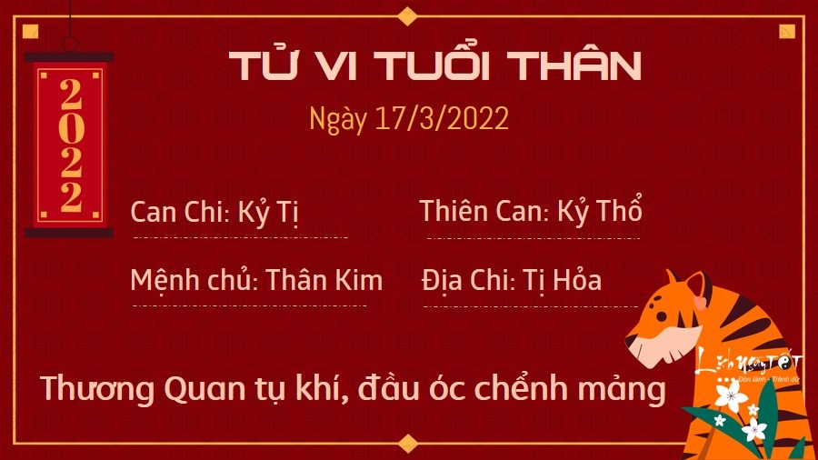 Hôm nay là một ngày làm việc không thực sự hiệu quả với người tuổi Thân do Thương Quan ảnh hưởng. Tâm trạng của bạn không ổn định, cộng thêm tác động ngoại cảnh nên đầu óc khá chểnh mảng. Thậm chí bạn còn dễ xảy ra tranh cãi do chuyện bé xé ra to, làm mọi chuyện ầm ĩ, phức tạp lên bất chấp hậu quả. Điều này ảnh hưởng ít nhiều đến tài lộc của các con giáp này. Các nguồn thu có dấu hiệu chững lại, đầu tư kinh doanh cũng chưa hiệu quả. Tiền vốn bỏ ra chưa thể thu lại khiến bạn khá sốt ruột và có thể đưa ra quyết định sai lầm trong lúc nóng vội. Chuyện tình cảm cũng không được tốt cho lắm. Ngũ hành xung khắc nhắc nhở, dường như bản mệnh đang cần sự đổi mới trong chuyện tình cảm để không đi vào lối mòn nhàm chán. Dù mọi thứ chưa đến mức đổ vỡ nhưng những vết rạn nứt đã xuất hiện khá rõ.