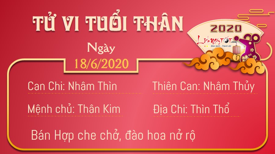 Thìn Thân Bán Hợp, chuyện tình cảm của người tuổi Thân nhờ vậy gặp nhiều may mắn hơn. Đôi lứa khăng khít, người độc thân được đào hoa dẫn lối, cho bạn cơ hội được gặp gỡ nhiều người khác phái và lựa chọn người thực sự phù hợp với mình. Hôm nay, Thiên Ấn đang ở bên và hỗ trợ bản mệnh trong công việc của mình. Dù nhiều vấn đề đồng loạt nảy sinh ngoài dự kiến nhưng bản mệnh vẫn giữ được sự bình tĩnh và giải quyết vấn đề một cách hiệu quả. Hãy cố gắng thể hiện năng lực của bản thân ngay khi đang có cơ hội. Đừng ngại ngần nếu bạn tỏa sáng giữa đám đông, bởi thành công là do mình tự tay giành lấy. Không phải ai cũng may mắn có được thành công như bạn.