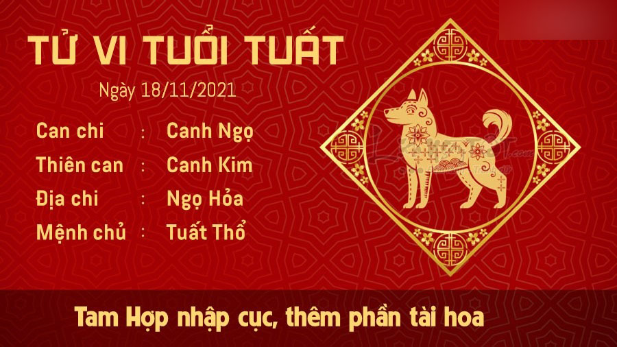 Tam Hợp mang tới cho tuổi Tuất sự tài hoa và sáng tạo, rất hữu ích cho công việc của bản mệnh ở thời điểm này. Vốn dĩ bạn là người đa tài, phù hợp với nhiều lĩnh vực khác nhau, nếu biết nắm chắc cơ hội trong hôm nay thì sẽ đạt được khá nhiều thành tựu rất đáng nể. Cát khí còn hỗ trợ người tuổi này gặp may mắn trong chuyện tiền bạc. Tuất được lộc trời ban nên tài vận tăng tiến, tiền bạc ào ào đầy ắp túi. Song bản mệnh cũng cần có kế hoạch chi tiêu hợp lý chứ đừng vung tay quá trán, tiêu xài hoang phí thì tiền nhiều đến mấy cũng sẽ đến lúc cạn kiệt. Hôm nay tuổi này còn được đón nhận những tin vui trong vận trình tình cảm. Nếu còn độc thân, bản mệnh sẽ có cơ may gặp được đối tượng ưng ý, còn nếu đã có người trong lòng thì hãy mạnh dạn bày tỏ lòng mình, thời điểm này rất thích hợp để tỏ bày tình cảm của mình với đối phương.