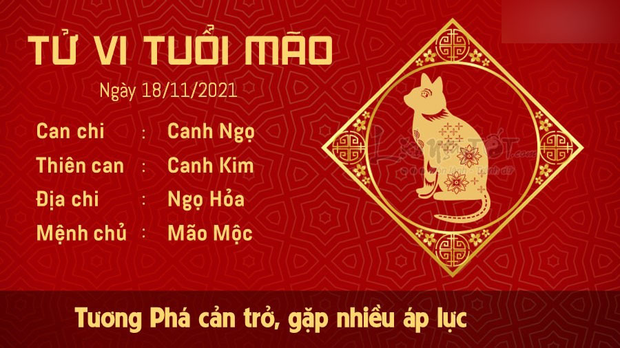 Ngày Ngọ Mão Tương Phá, người tuổi này có thể gặp phải rất nhiều trắc trở và áp lực. Tuy nhiên bạn cũng đừng quá lo lắng vì mọi chuyện sẽ dần được giải quyết ổn thỏa miễn là bạn đủ bình tĩnh để nhìn nhận sáng suốt vấn đề. Niềm an ủi rất lớn cho Mão là tài chính có dấu hiệu tăng tiến nhờ Chính Tài hỗ trợ. Bạn có nhiều cơ hội kiếm tiền, mở rộng hay đầu tư kinh doanh. Những ai buôn bán cũng thu về một khoản lợi nhuận kha khá cho riêng mình. Về tình cảm, có vẻ như hiện tại mối quan hệ của bạn và người ấy đang trong giai đoạn hết sức căng thẳng vì những hiểu lầm, ghen tuông khó tháo gỡ. Đã vậy, những lần chiến tranh lạnh càng khiến hai bạn không tìm ra cơ hội để trò chuyện rõ ràng mọi thứ.
