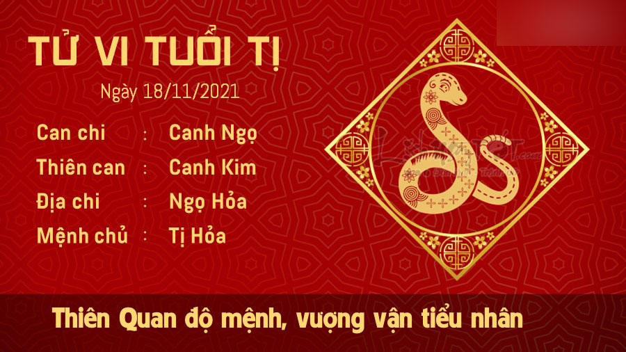 Thiên Quan xuất hiện cảnh báo tiểu nhân vận của người tuổi Tị trong hôm nay khá vượng. Bản mệnh dễ bị những chiêu trò của đối phương cản trở bước tiến, công việc cũng xuất hiện trục trặc liên tục. Có nhiều khi việc đã sắp hoàn thành lại bỗng có vấn đề chen ngang, khiến bạn tốn nhiều thời gian và công sức để khắc phục. Trong ngày không có may mắn đồng hành như hôm nay, các kế hoạch dự định tiến hành đều cần được tính toán thận trọng, hạn chế tối đa những sơ suất vốn đã có thể tránh được. Nếu cảm thấy lúng túng, bạn có thể xin lời khuyên của người có kinh nghiệm để nhìn nhận vấn đề thông suốt hơn. Trong ngày Hỏa khí vượng, mệnh chủ cũng nên chú ý kiểm soát cảm xúc để giữ gìn hòa khí trong các mối quan hệ. Có thể bạn không có ác ý nhưng cách diễn đạt có phần gay gắt của bạn đang gây ra hiểu lầm không nhỏ có thể làm tổn thương người đối diện.
