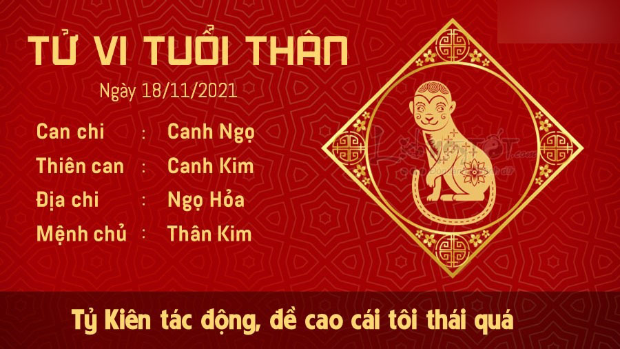 Tỷ Kiên xuất hiện trong vận trình ngày thứ 5 này của người tuổi Thân là dấu hiệu cho thấy bạn đang có xu hướng đề cao cái tôi của mình lên quá, làm mọi thứ theo ý muốn mà không quan tâm đến cảm xúc của người khác hay những quy định sẵn có. Sự tùy hứng này có thể gây không ít rắc rối cho con giáp này, đừng chỉ vì lợi ích trước mắt của cá nhân mà xem nhẹ những nguyên tắc ở nơi làm việc. Bạn cần nhìn nhận rõ vị trí và bổn phận của mình, tuân thủ theo đúng những gì được yêu cầu nếu muốn đường tiến thân rộng mở. Hỏa – Kim xung khắc gây ra nỗi buồn tình cảm cho người độc thân khi chưa tìm thấy đối tượng phù hợp với mình. Nhưng bạn cũng chớ nên ủ rũ buồn lòng. Bạn nên ra ngoài gặp gỡ nhiều bạn bè hơn, hoặc đăng ký một vài lớp học kĩ năng vừa nâng cao chuyên môn vừa biết đâu sẽ gặp được một nửa của mình.