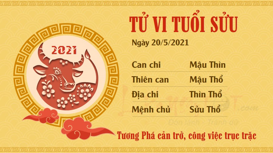 Tương Phá cảnh báo về những trục trặc trong công việc mà người tuổi Sửu sẽ phải đối mặt trong ngày hôm nay. Điều bạn nên làm lúc này là hãy giữ một trạng thái tinh thần thật tỉnh táo, đừng nên nóng giận vì những khó khăn đang mắc phải. Cũng trong hôm nay, Kiếp Tài ngáng trở những chú Trâu trên chặng đường tìm kiếm tài lộc cho mình. Hung tinh này mang theo điềm báo phá tài khá lớn, nếu bản mệnh không cẩn trọng đề phòng thì tài lộc có tụ rồi cũng tiêu tán, tiền bạc kiếm được bao nhiêu, vào cửa trước rồi cũng ra hết cửa sau. Người làm kinh doanh càng cần phải thận trọng trong các quyết định đầu tư của mình. Thổ khí vượng khiến cơ thể không được ổn định, tâm trạng lúc lên lúc xuống.