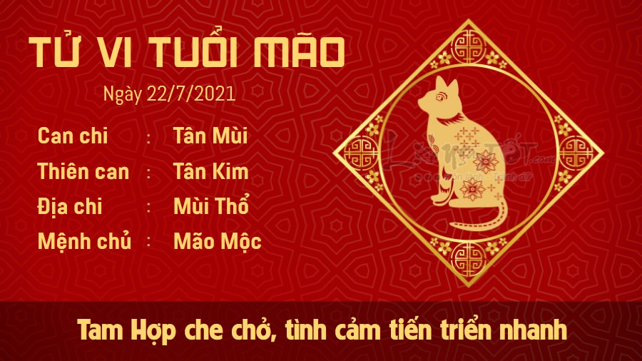 Tam Hợp che chở, người tuổi Mão sẽ gặp nhiều niềm vui và bất ngờ trong chuyện tình cảm. Đây là lúc thích hợp để đôi lứa đang yêu tiến đến một trang mới trong chuyện tình cảm lứa đôi. Còn người độc thân cũng đã mạnh mẽ buông bỏ quá khứ để chào đón hiện tại, tương lai tốt đẹp hơn. Cát tinh này còn hỗ trợ rất nhiều cho những chú Mèo trong công việc và tài lộc. Công việc trong ngày diễn ra suôn sẻ và may mắn vô cùng. Quý nhân nâng đỡ, giúp cho mệnh chủ sớm tháo gỡ khó khăn, hòa giải khúc mắc với đồng nghiệp, đường công danh không có điều gì phải lo nghĩ. Chuyện làm ăn của bản mệnh thuận lợi, tiền bạc hanh thông, lợi nhuận càng ngày càng tăng tiến.