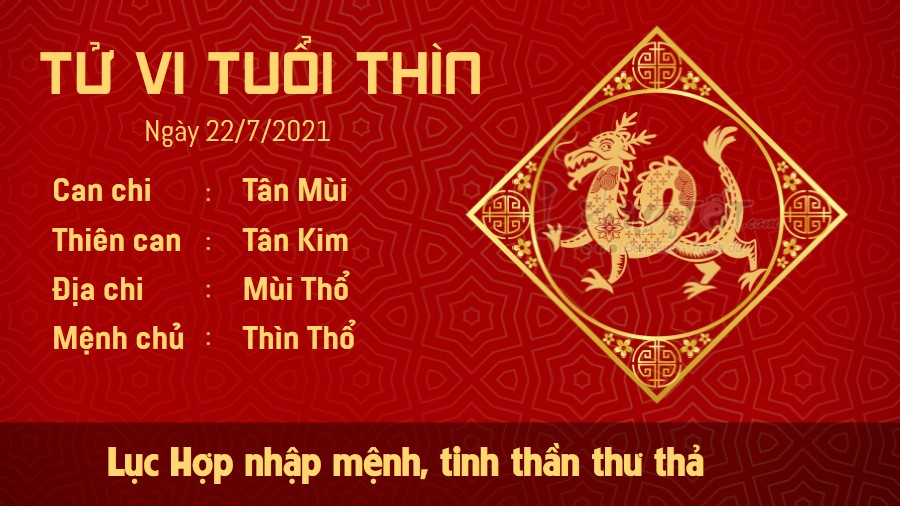Lục Hợp xuất hiện giúp tuổi Thìn có một trạng thái tâm lý rất thư thả, hăng hái và nhiệt tình trong mọi việc. Bản mệnh có tư tưởng thông thoáng trong mọi vấn đề, vì thế, dù có phải đối mặt với sự cố nào bạn cũng nhanh chóng thích nghi và tìm ra giải pháp thích hợp. Dường như không có việc gì có thể làm khó bạn ngay lúc này. Hơn nữa, cát tinh này còn đảm bảo cho con giáp này có được nguồn thu nhập ổn định, không cần phải lo lắng quá nhiều về vấn đề tiền bạc, nhờ thế mà mệnh chủ có thể thoải mái làm những việc mình muốn. Thổ vượng làm giảm bớt niềm vui trong ngày của những chú Rồng khi mối quan hệ vợ chồng tồn tại nhiều mâu thuẫn và khắc khẩu.