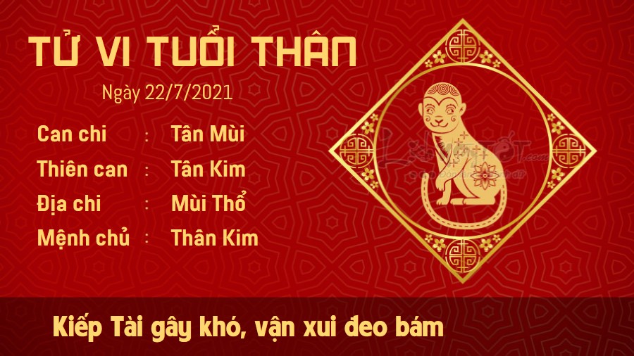 Kiếp Tài cảnh báo vận xui đang đeo bám tuổi Thân ở phương diện tài chính trong ngày này. Bản mệnh có điềm báo mất tiền hao của khá lớn. Bạn tốt nhất nên giữ tiền cẩn thận trong hôm nay, chớ nên tùy tiện cho vay mượn hay ham mê các trò đỏ đen, cá cược. Những dự án hợp tác làm ăn dang dở cũng bị đình trệ, đối tác bày tỏ bất mãn khiến con giáp này đau đầu tìm cách xoay sở. Vấn đề có thể không xuất phát từ phía bạn nhưng bạn là người tham gia trực tiếp nên không tránh được liên can. Có lẽ vì bạn đang tập trung cho sự nghiệp nên hai bạn ít có khoảng thời gian riêng dành cho nhau, từ đó sự gắn kết giữa hai người cũng không còn bền chặt như trước, rất dễ tạo cơ hội cho kẻ thứ 3 chen chân.