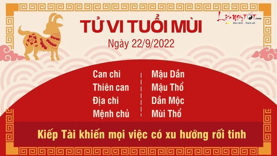 Kiếp Tài khiến mọi việc của con giáp tuổi Mùi có xu hướng rối tinh trong ngày hôm nay. Nhưng thay vì hoàn thành mọi thứ cùng lúc, hãy lập ra một danh sách việc cần làm và xử lý chúng theo thứ tự. Mộc - Thổ xung khắc chỉ ra rằng bạn có xu hướng "đứng núi này trông núi nọ" thay vì chỉ nhìn nhận mọi việc ở thái độ khách quan nhất. Nên có sự cân nhắc, lắng nghe đôi bên và lắng nghe cả cảm xúc cá nhân để đưa ra một lựa chọn phù hợp. Chuyện tiền bạc không nên tiết lộ hết cho người ta biết, thậm chí nên sống đơn giản thôi để tránh bị kẻ gian dòm ngó, gây nguy hiểm cho bản thân. Những ai thích nhận xét về giàu nghèo cũng chỉ nhìn thấy bề ngoài của bạn thôi, chỉ có bạn mới được biết sự thật.