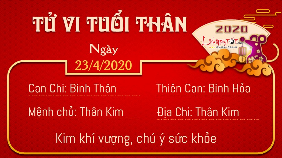 Với người tuổi Thân, thứ 5 này là ngày hốt vàng hốt bạc luôn đó. Thiên Tài chỉ lối dẫn đường, chỉ với nghề tay trái cùng chút tài lẻ thôi mà con giáp này thu được không biết bao nhiêu tiền bạc về tay. Bản mệnh là người thông minh, lanh lợi, làm đâu chắc đó, công việc lúc nào cũng hanh thông, ổn thỏa. Hơn nữa, những chú Khỉ có mục tiêu của riêng mình nên không để cho bản thân ngừng bước khi mà chưa đạt được mục tiêu đặt ra từ trước đó khiến nhiều người rất nể phục. Ngày Kim khí vượng, bạn cần chú ý đến sức khỏe của mình. Kim vượng có thể làm ảnh hưởng đến các chức năng của phổi, khiến bản mệnh có thể gặp vấn đề do viêm khí quản, viêm họng, bệnh về cột sống, gân cốt, răng, cơ bắp.